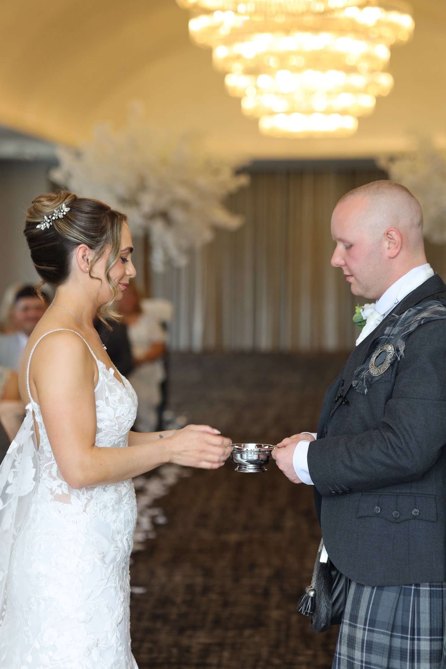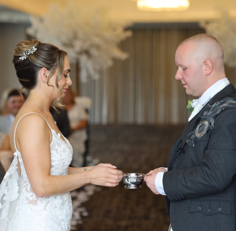 A traditional Scottish “loving cup” shared between the couple, representing trust, unity, and the sharing of life together.